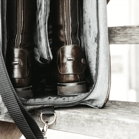The Kentucky Horsewear Boots Bag offers protection to your boots during transportation, at shows, or at home. The Boots Bag has artificial rabbit skin on the inside to avoid scratches on the leather. The name tag on the front can be turned over and personalized. The Boots Bag can be easily carried thanks to the handle on the top or to the long nylon strap, which can be adjusted in length. The Boots Bag has the same diamond quilting and artificial leather piping as our Bridle Bag, stable set (curtain, guard, head protector), and our rugs! Therefore, this Boots Bag tops of the Kentucky show look. The Boots Bag is machine washable at 30°, no dryer.