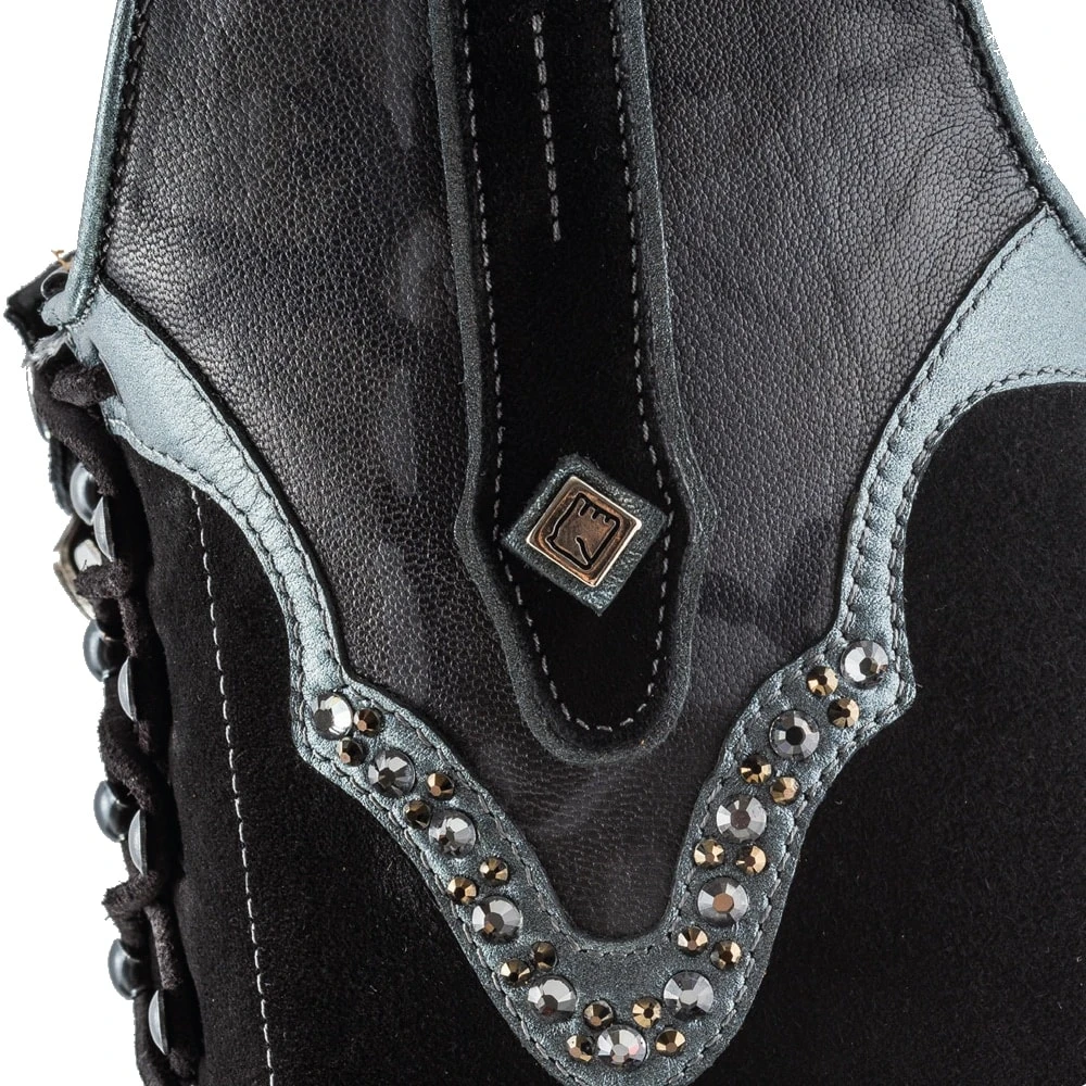 Bring a statement to your wardrobe with the custom Lynn version of the De Niro botticelli riding boot! This beautiful boot is part of the De Niro Savage collection. In contrast to the standard Botticelli model, this custom version is made with the zipper diagonally in the front of the boot, instead of in the back. The front lace in combination with this zipper ensures a perfect and easy fit. The finishing touch to this riding boot is the top in grey camouflage leather, with a stripe underneath that was decorated with several Swarovski elements and other gems. All Botticelli De Niro boots are made with strong Italian calf leather. The Vibram sole is stitched to the bottom of the foot, to prevent the boot and sole from wearing out easily.