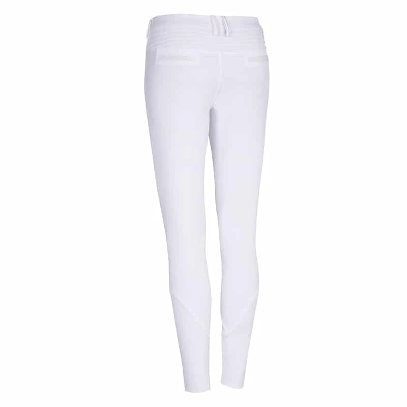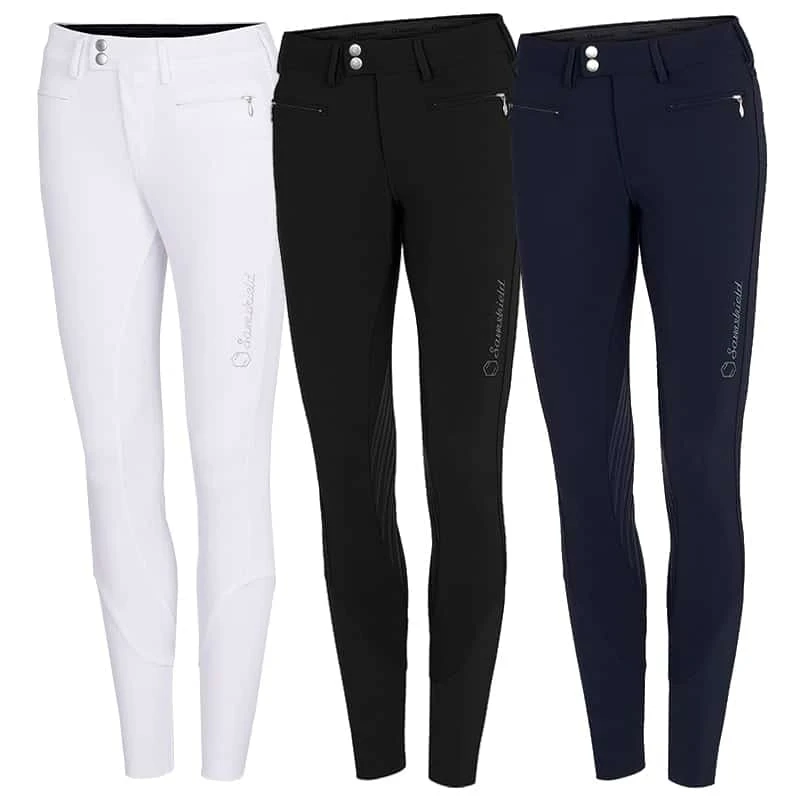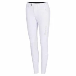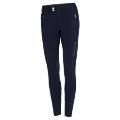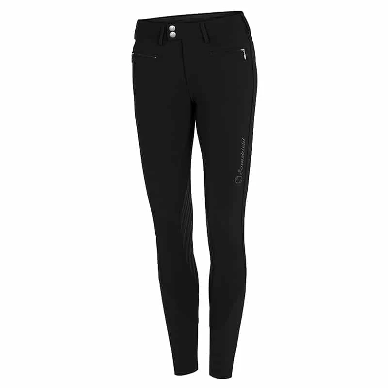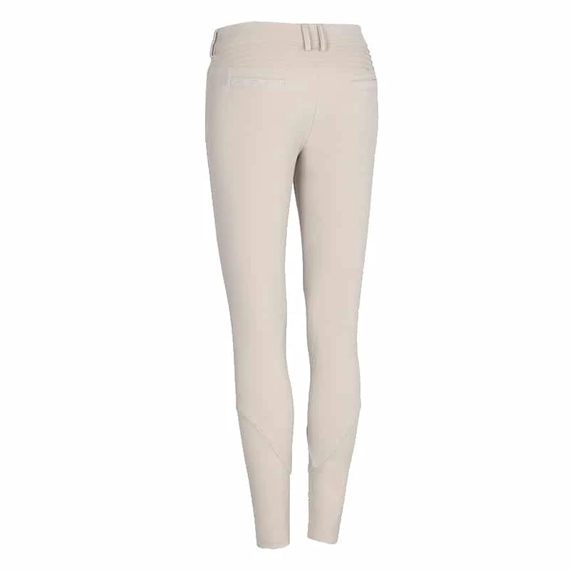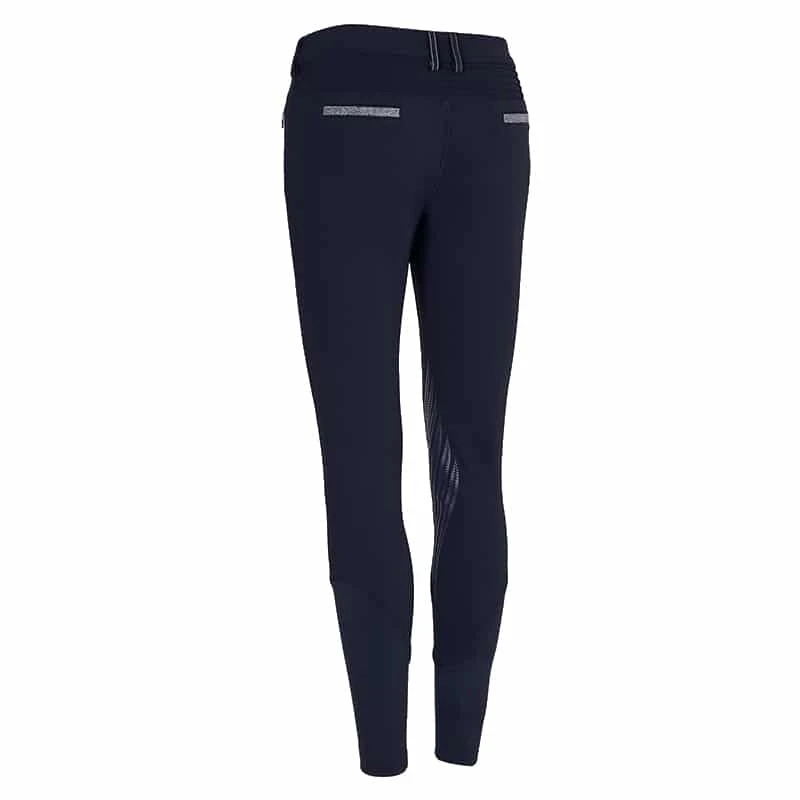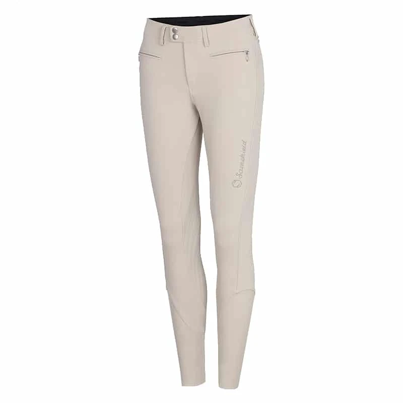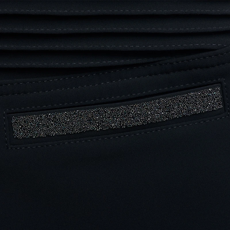 These elegantly tailored Samshield Adele breeches feature a knee silicone grip and two zipped front pockets. Samshield breeches are made of reinforced stretch fabric, which has a compression effect, making them very comfortable and flattering. This fabric is also very breathable and has undergone moisture control and UV protection treatment, making them perfect for hotter days. A very innovative silicone grip strip on the inside of the waistband will prevent shirts from rising. These breeches are gorgeously embellished with the Samshield logo on the thigh, which is finished in Swarovski crystals. The back is decorated with pockets with Swarovski Crystal fabric details and horizontal pleats along the waistband.