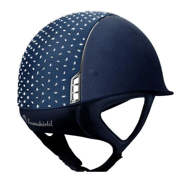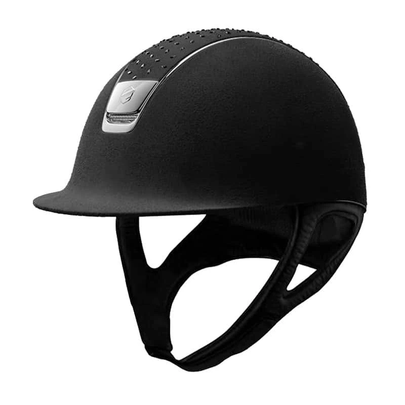 This sparkling Samshield Alcantara all over suede helmet will make you stand out. The helmet is designed with a crystal comet embellished top. The chrome silver blazon and trim give this helmet a classy finish.
