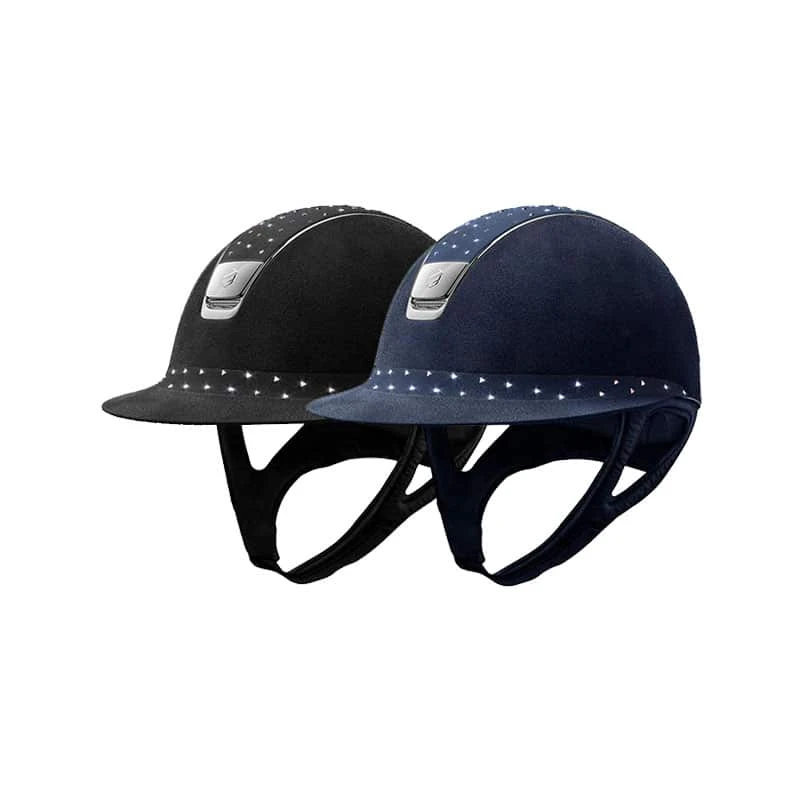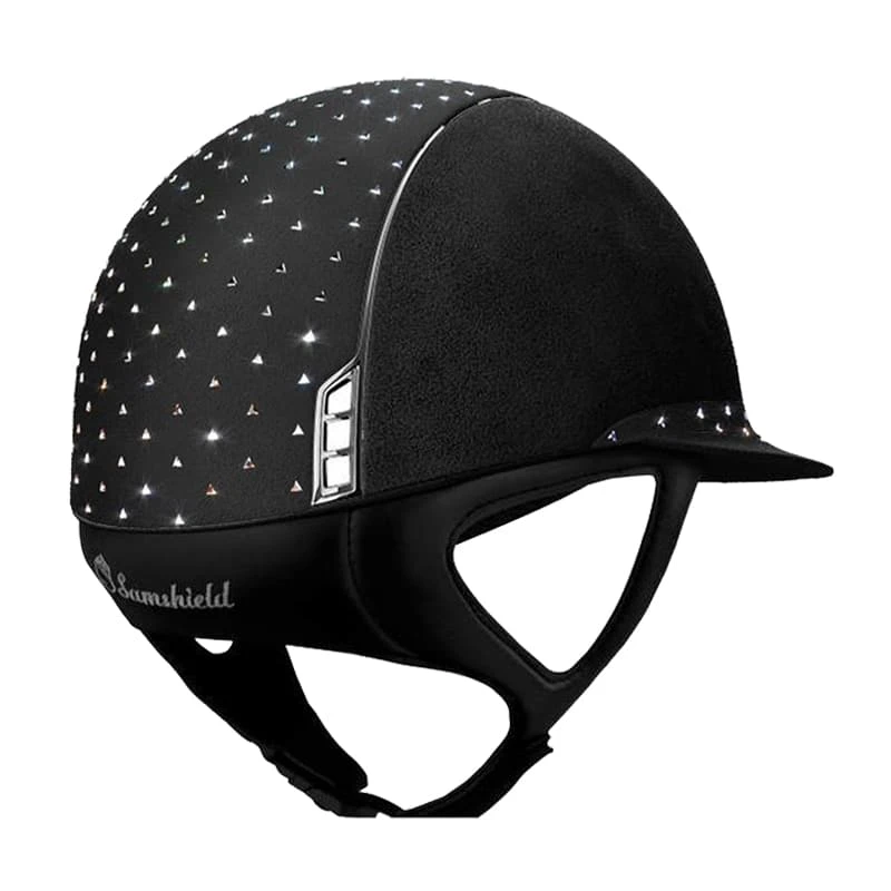 This lovely Samshield Miss shield helmet is fully finished in Alcantara suede and makes heads turn. The top and band along the extra-wide visor, are embellished with a pattern of triangle-shaped clear Swarovski crystals. The blazon and trim on this helmet are made in chrome silver, ensuring a streamlined look.