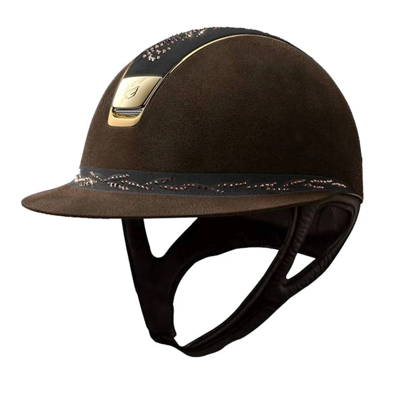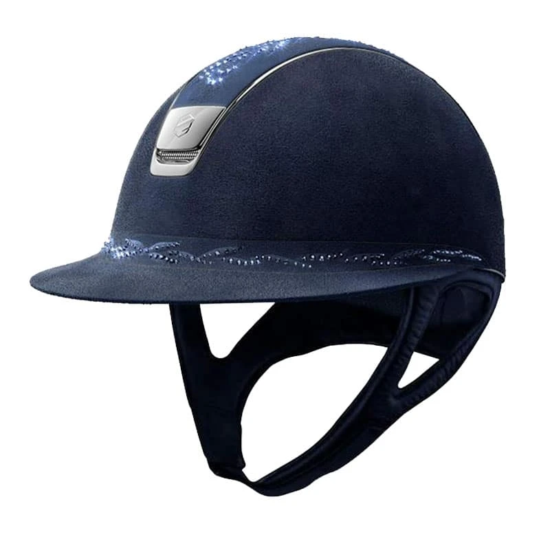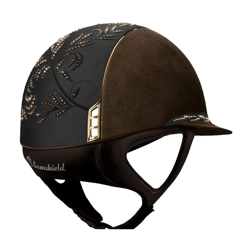 This lovely Samshield Miss shield helmet is fully finished in Alcantara suede and features gorgeous decorations. The top and band along the extra-wide visor, of this helmet are embellished with a floral pattern of real Swarovski chrystals. With this model, the black and blue navy versions have silver chrome blazon and trim, whereas the brown version has a gold chrome blazon and trim.
