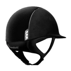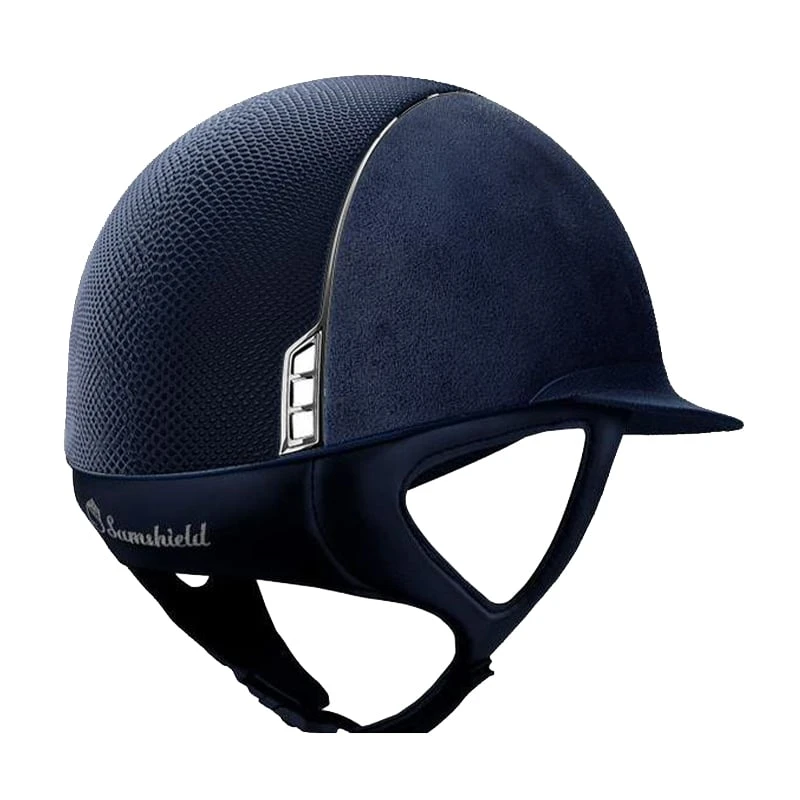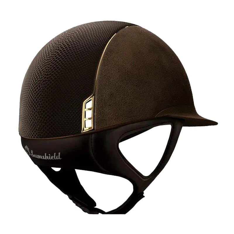 This modern Samshield Miss shield helmet has the shell finished in Alcantara suede and a stylish Lizard leather top. With this model, the black and blue navy versions have silver chrome blazon and trim, whereas the brown version has a gold chrome blazon and trim.