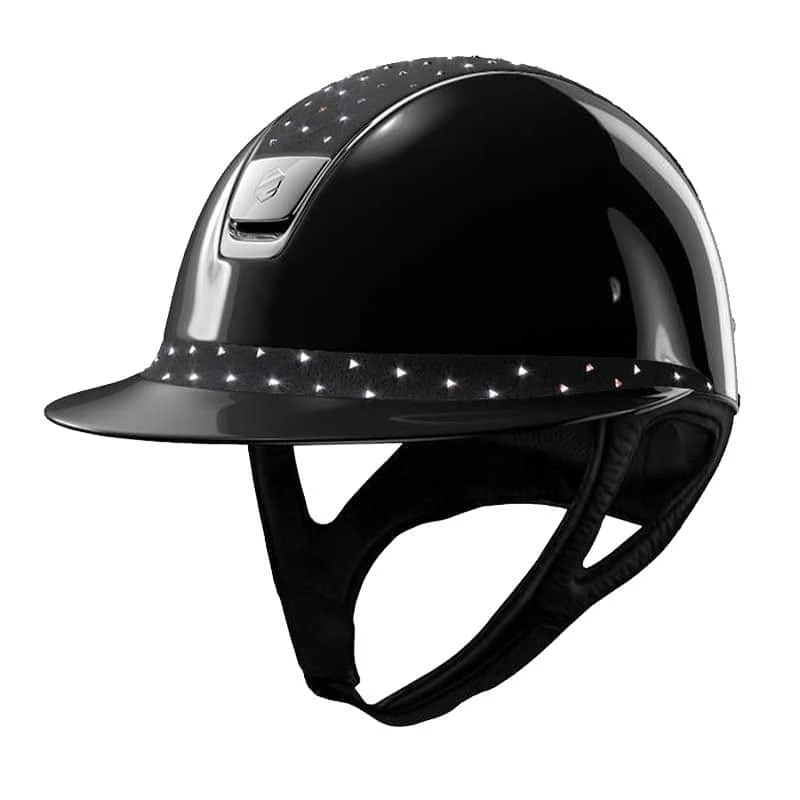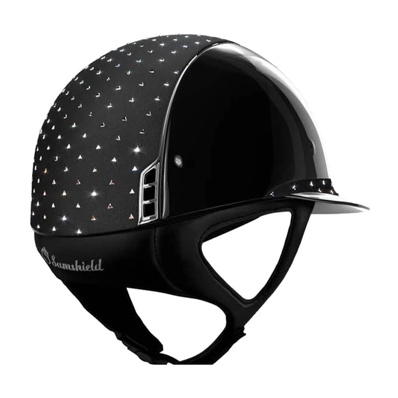 This charming Glossy Samshield Miss is the embodiment of contemporary elegance. The Alcantara suede top and band along the extra-wide visor, are embellished with fancy triangle-shaped Swarovski crystals, combined with the silver chrome blazon and trim and glossy shell, this helmet has a luxurious look.