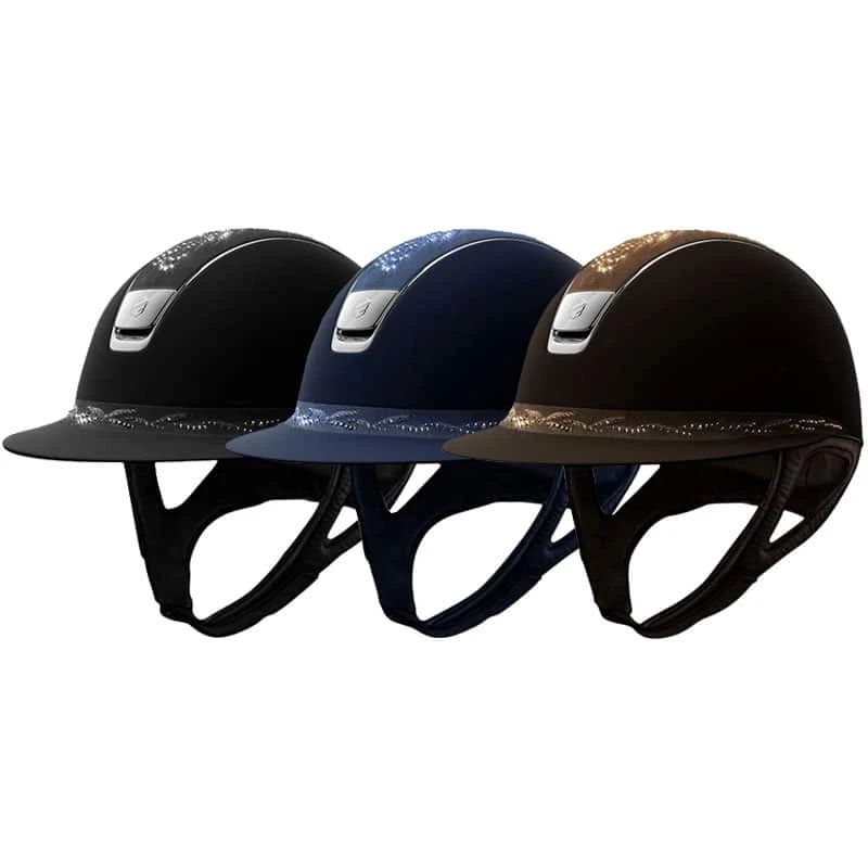 This wonderful Samshield Miss Shield SW Flower helmet is made with the shell in Shadowmatt material. The Miss Shield model has a wide visor with a decorative band. The top and band on this helmet are both made in Alcantara material, with a gorgeous Swarovski flower design of embroidery and gems. The trim and logo are made in chrome silver.