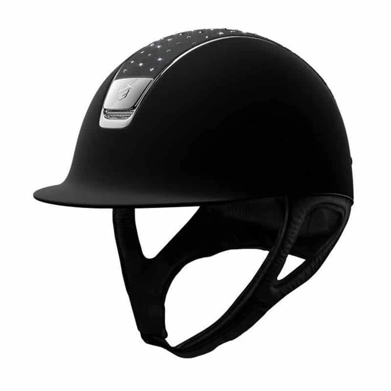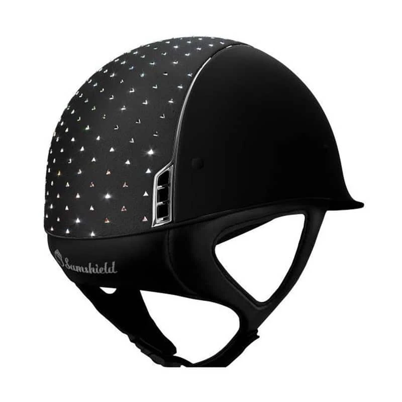 This striking Shadowmatt helmet with fancy swarovski top is an absolute looker. The all over matte shell and silver chrome piping gives the helmet a classy finish. The alcantara suede top is beautifully decorated with swarovski crystals and gives this helmet a luxury feel.