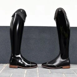 This pair is almost fully finished in Brushed black and features a toe cap lined with Luxury silver piping. This pair is also decorated with the Lisa top in Buongiorno black lined with silver piping and embedded crystal fine rocks. To ensure lasting beauty, the outer shaft is reinforced. This ensures a quiet leg, whilst a soft patch of WRAT black leather on the inside leg ensures maximal contact with your horse.