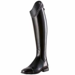 This pair is almost fully finished in Brushed black and features a toe cap lined with Luxury silver piping. This pair is also decorated with the Lisa top in Buongiorno black lined with silver piping and embedded crystal fine rocks. To ensure lasting beauty, the outer shaft is reinforced. This ensures a quiet leg, whilst a soft patch of WRAT black leather on the inside leg ensures maximal contact with your horse.