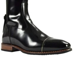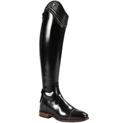 This pair is almost fully finished in Brushed black and features a toe cap lined with Luxury silver piping. This pair is also decorated with the Lisa top in Buongiorno black lined with silver piping and embedded crystal fine rocks. To ensure lasting beauty, the outer shaft is reinforced. This ensures a quiet leg, whilst a soft patch of WRAT black leather on the inside leg ensures maximal contact with your horse.