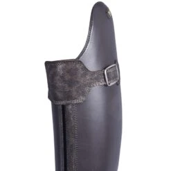 This sporty yet elegant Marron design is a custom made version of the De Niro Polo model. This pair is made with the shaft and foot in matte Caffè WRAT leather. This Italian calf leather is handcrafted by experts in bootmaking in the DeNiro Boot Co. factory. The details on this boot, like the zip cages and the big strap zipper protector, are made in gold brown Infinito Metal leather, which pulls the overall look of this boot together beautifully. The big strap zipper protector closes over the front zipper with a silver coloured press buckle. The use of this leather makes these boots part of the De Niro Infinito collection. The high dressage top that is used on this pair, makes this design ideal for riding dressage. The brown wood-look Vibram sole adds a verry nice final touch to this design. The leather that is used on these boots is soft and supple to ensure optimal comfort, but stiff enough to stay up straight without boot trees in them. This ensures optimal contact between the horse and the rider.