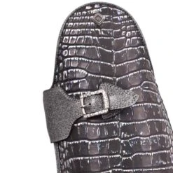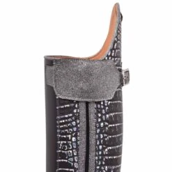 This pair has a Malibo Lux Nero outer shaft, which is a black and holographic Croco leather. The inner shaft and foot are made in WRAT black leather, to ensure a durable boot. The boot is decorated with a Luxory silver Big strap with Swarovski buckle, and a toecap with silver piping. Lastly, the addition of the dark brown wooden-look sole and Luxory silver zip cages make for a very glamorous look.