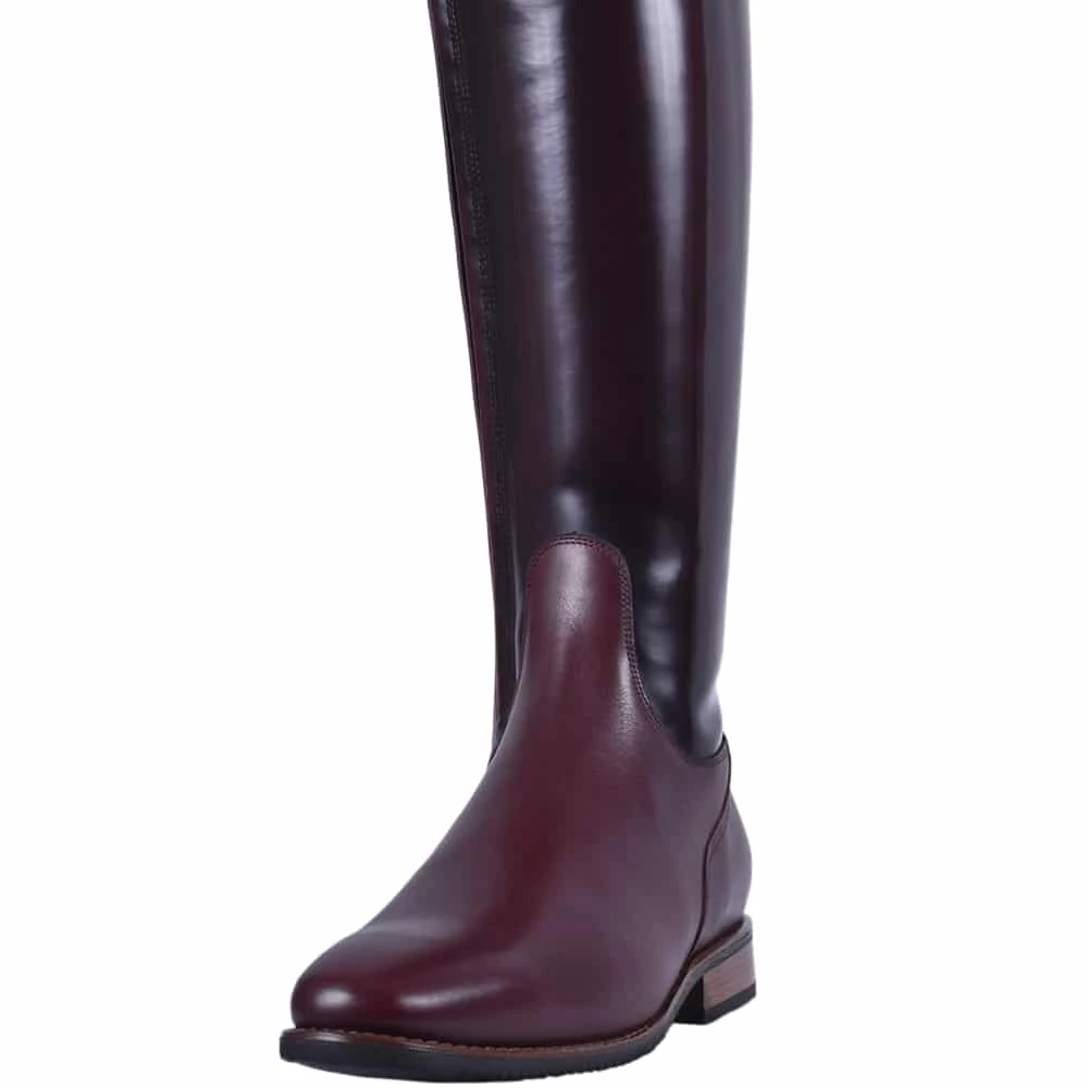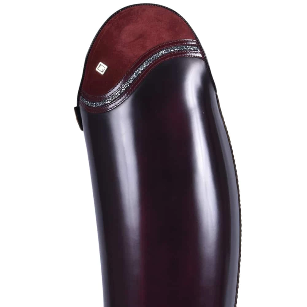 This gorgeous Admirlo Raffaello boot is a custom made design of the standard De Niro Raffaello model. This model is made with a zipper diagonally in the front of the boot, on the inside of the leg. The foot of these boots is made in matte burgundy leather, while the shaft is made in brushed burgundy leather. These boots are made with a harder outside of the shaft, in order to keep the brushed leather as smooth and beautiful as possible. The Up-Top on this design was made in the unique Camoscio leather, underlined with a gorgeous and unique Crystal detail. The zipper in this model is placed diagonally in the front of the boot, on the inner side of the leg. The outside of the shaft of this boot is harder and the inside of the shaft is made of soft leather. This ensures the lasting beauty of the brushed leather and optimal comfort for any rider.