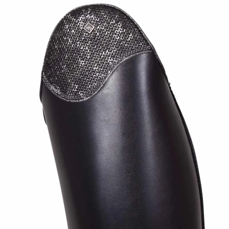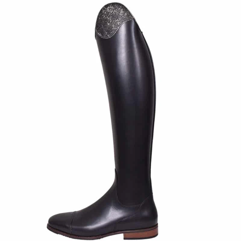 This elegant Miley boot is a DeNiro Raffaello model, designed with a few custom alterations. This pair features the high dressage Salentino top in Intreccio Argento leather, with eye-catching silver piping along the stitching. The shaft and foot of this boot made in matte black leather. As a finishing touch, this pair has an E3 toe cap with silver piping along the stitching.