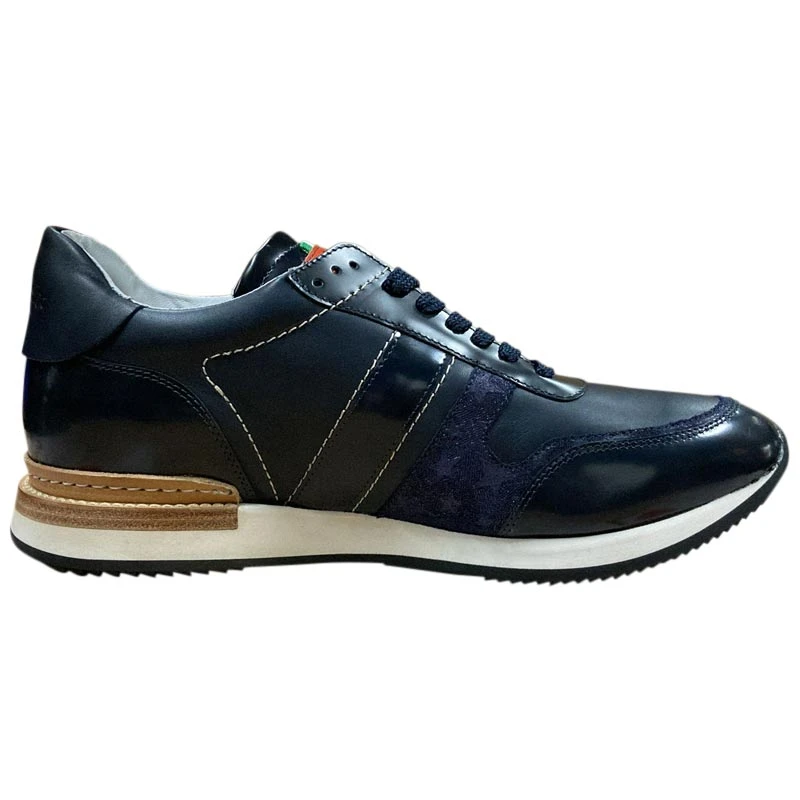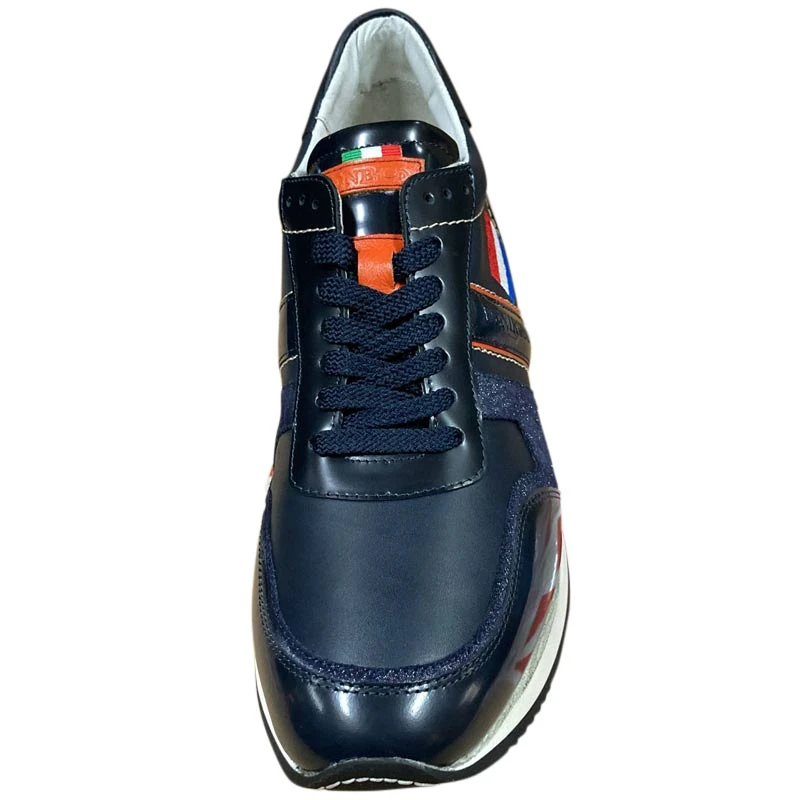 This unique pair of custom-made sneakers is the De Niro Viceversa sneaker model made in Brushed Blue in combination with WRAT Indaco. The details on this pair of De Niro sneakers are made in Orange. This combination of materials ensures a stunning look.