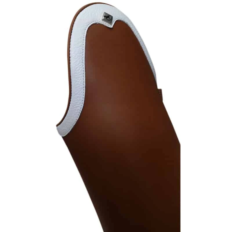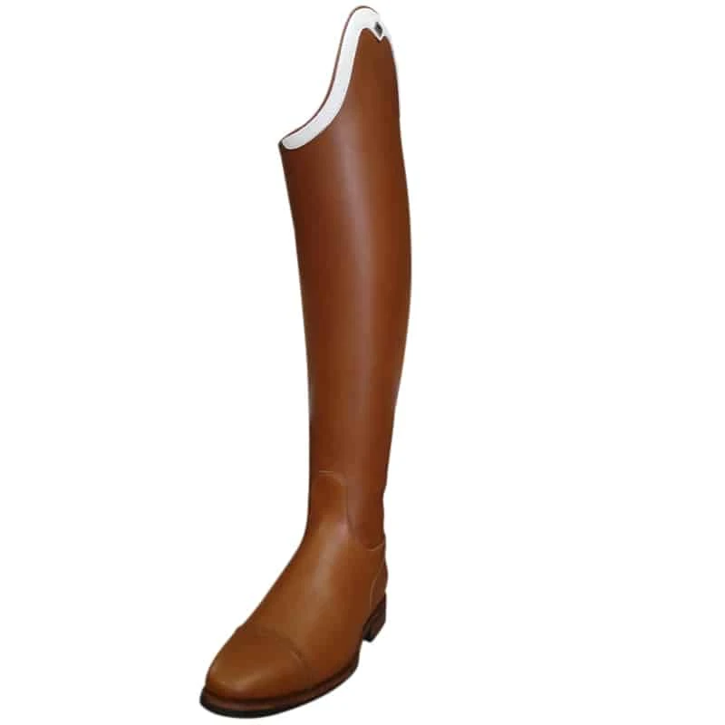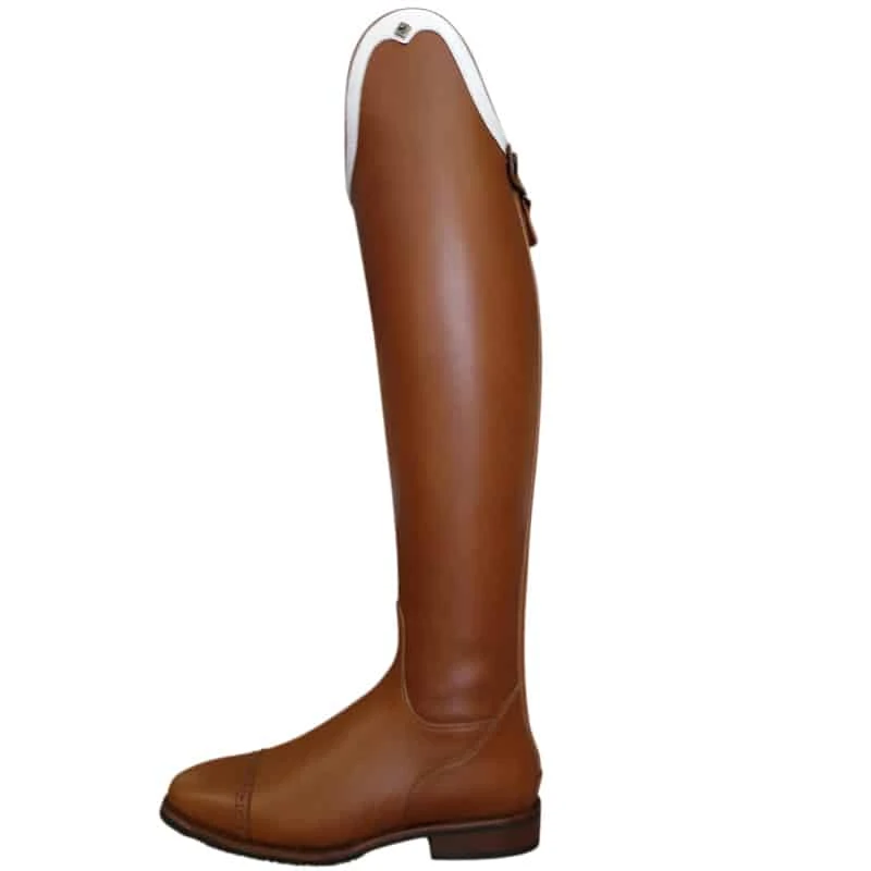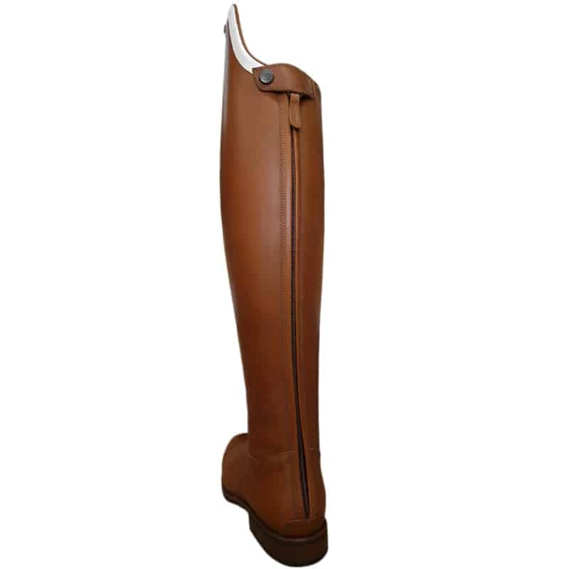 The beautiful Volta SL model is a dressage model by the brand De Niro Boot Co. The boots are handmade in Italy, by specialised craftsmen with years of experience. What’s particularly special about the Volta SL model boots is that they are a dressage model, but with a zipper at the back. Other De Niro Boot dressage models often have the zipper diagonally in the front of the boot. The zipper at the back makes it easier to put the boots on and take the boots off. This back zipper position also offers better durability, since the leather around the ankle will not fold, stretch, or damage as much as it may with stepping into a boot with the diagonal zipper in other dressage models like the Raffaello and Bellini model. Additionally, the zip cages are less likely to break since they are in a less vulnerable spot. The De Niro Volta SL boot features a beautiful high dressage arch of 10cm for calf sizes S and smaller. From calf size M and up, the dressage bow will be 8cm tall, which is the standard high dressage bow for other De Niro dressage models. Like any other De Niro model, the De Niro Volta SL dressage boots can be completely customized to meet your every wish.