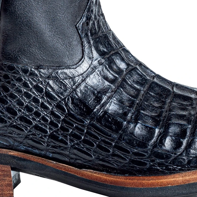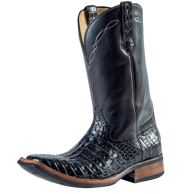 This boot features a Buffalo Black top and a Caiman black vamp, and pull straps. The boots are finished off with the square toe Trainer sole, fancy stitching and punched holes in the Floretta.