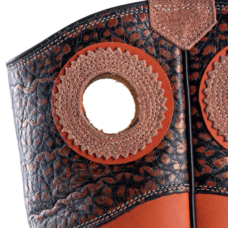 This boot features a Buffalo Cotto top, and an Etna Cotto vamp and top decorations. The boots are finished with the square toe Trainer sole, punched holes in the florreta, and a wave top.