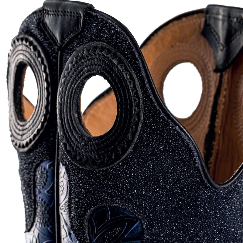 This boot features a Greta blue top decorated with a flame patern in Polvere di Stelle black. The vamp is made in Buffalo Black. The boots are finished with the square toe Trainer sole, punched holes in the florreta, and a flame top.