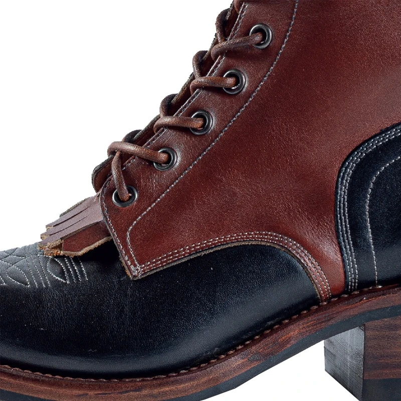 This boot has a Brandy top and a Buffalo Caffé foot. The boots feature the round toe Paker sole and fancy stitching.
