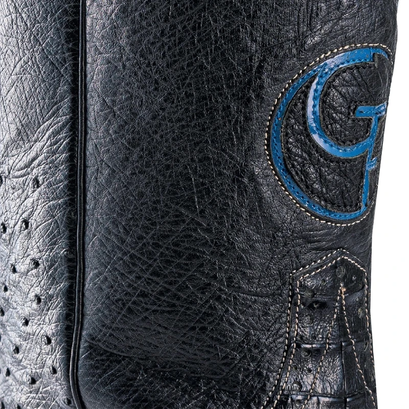 This boot features an Buffalo Ostrich black top, a Caiman black vamp, and punched holes on the Florretta. The boots are finished with the square toe Trainer sole and fancy stitching.