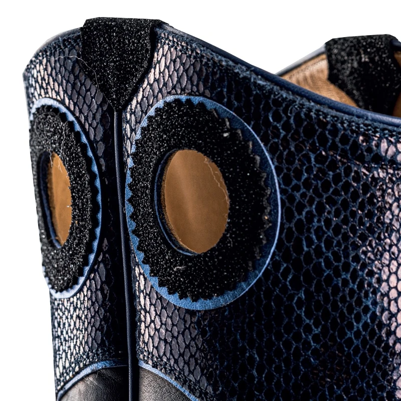 This boot features a Soft Buffalo Black top, Pitone Jeans top decorations, and a buffalo Black foot. The boots are finished with the square toe Trainer sole, fancy stitching, and a wave top.