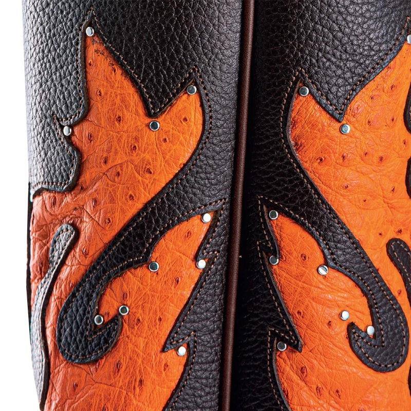 This boot features a Soft Buffalo Brown top with top decoration Buffalo Brown527. The vamp and Fire decorations are in Ostrich Orange. The boots are finished with the square toe Trainer sole, punched holes in the florreta, and a wave top.