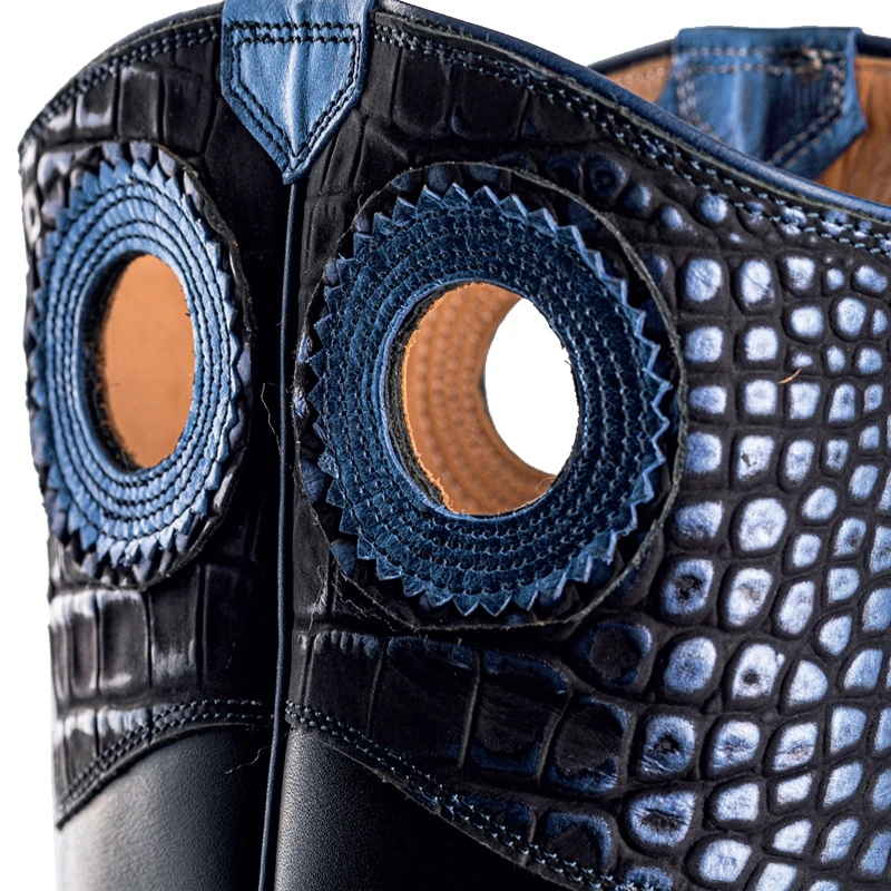 This boot features a Buffalo black top, and a Malibu Lux. Blue vamp and top decorations. The boots are finished with the square toe Trainer sole, punched holes in the florreta, and a wave top.