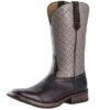 This outstanding Rural Cowboy boot is a custom made Roper 750 New boot. This versatile model is a new version of the staple DeNiro Roper boot. It always features these decorated pull holes and side welts, and it has the lowest top in our assortment of western boots. This boot features a Greta blue top, a Buffalo Black vamp, and punched holes on the Florretta. The boots are finished with the square toe Trainer sole and fancy stitching.